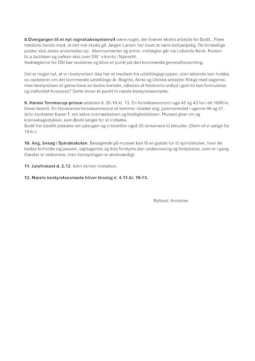 8.Overgangen til et nyt regnskabssystemvil være noget, der kræver ekstra arbejde for Bodil.. Flere trøstede hende med, at det nok skulle gå. Jørgen Larsen har lovet at være behjælpelig. De forskellige poster skal deles anderledes op. Abonnementer og entrè- indtægter går via Lollands Bank. Resten bl.a.butikken og cafèen skal over DSI`s konto i Nykredit.