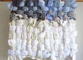 Ane Henriksen arbejder med stærk symbolik og visuelt bedrag i sine store vævninger. Hun har til udstillingen på Køng Museum vævet Kontorlandskab – Sommer af uafhentede skjorter fra hendes lokale renseri.